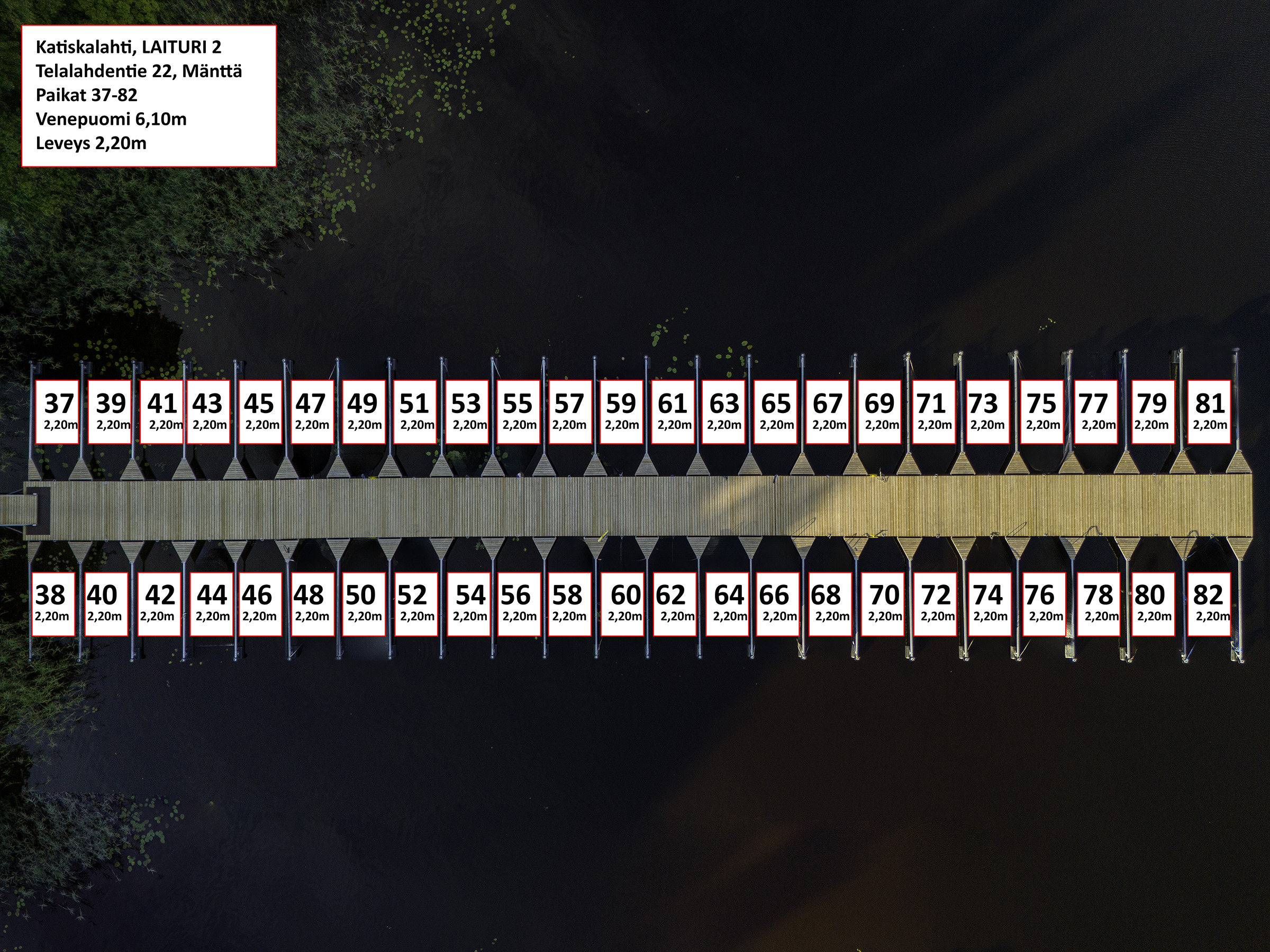 Laituri uusitaan 04/2025. Venepaikkoja 46. Satamassa veneenlaskupaikka, jonka yhteydessä saattolaituri.